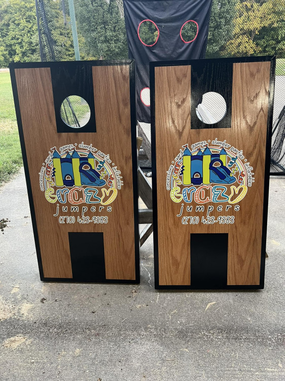 Turn up the fun at any outdoor gathering with this cornhole game set. This set includes 8 beanbags and 2 wooden cornhole boards, each regulation-sized and varnished with crazy jumpers logo.